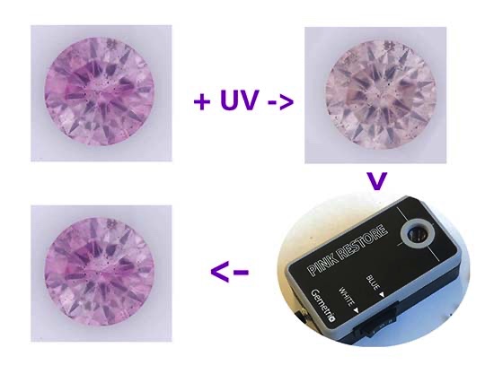 When Argyle pink diamonds are illuminated with light having wavelengths below about 420 nm, the pink colour will be bleached to an increasing extent with lower wavelengths. At SW wavelengths the pink colour may be totally removed generally leaving the brownish component. The colour will only return with exposure to light having wavelengths longer than about 450 nm. Time itself will not restore the colour. Often diamonds that are tested either with an Inspector or during fluorescence grading need to be packaged or stored immediately after inspection, without affording the time to expose the gem to ambient white light. A Pink Restore illuminates with strong light having the optimum wavelength for restoration. Typically about 1 minute is all that is necessary to restore the colour in a pink diamond that has been totally bleached. |